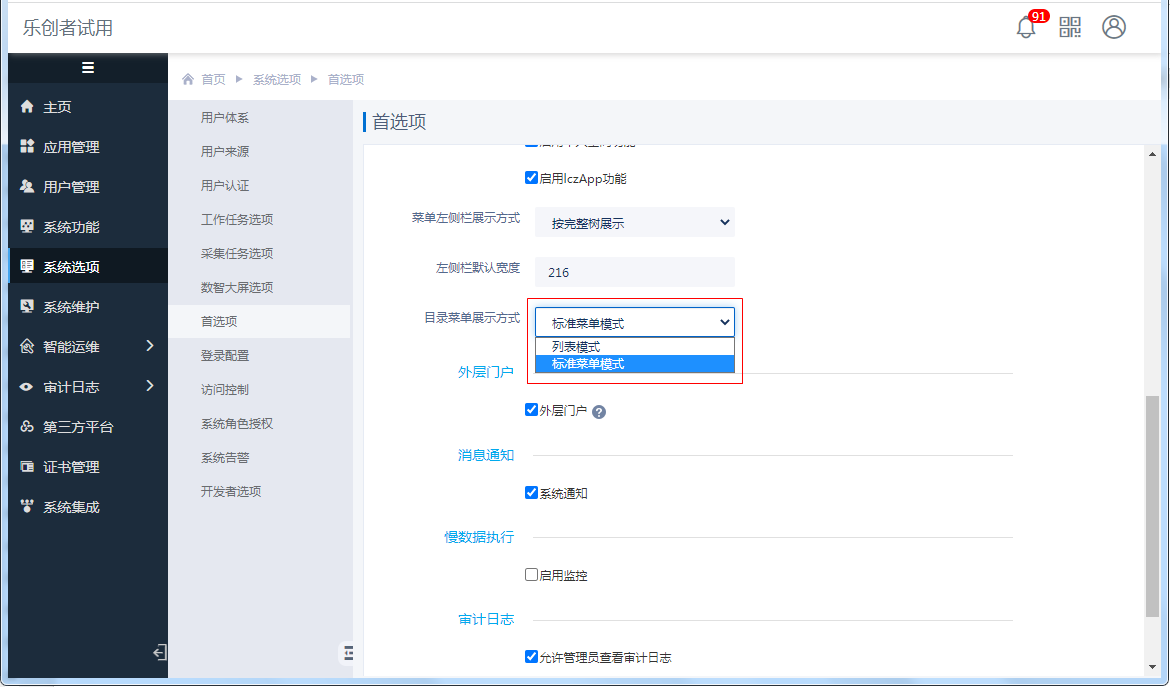 类似地,外层门户主页选择的的是系统功能中菜单栏或lczAPP工作台中的目录。