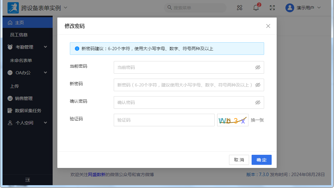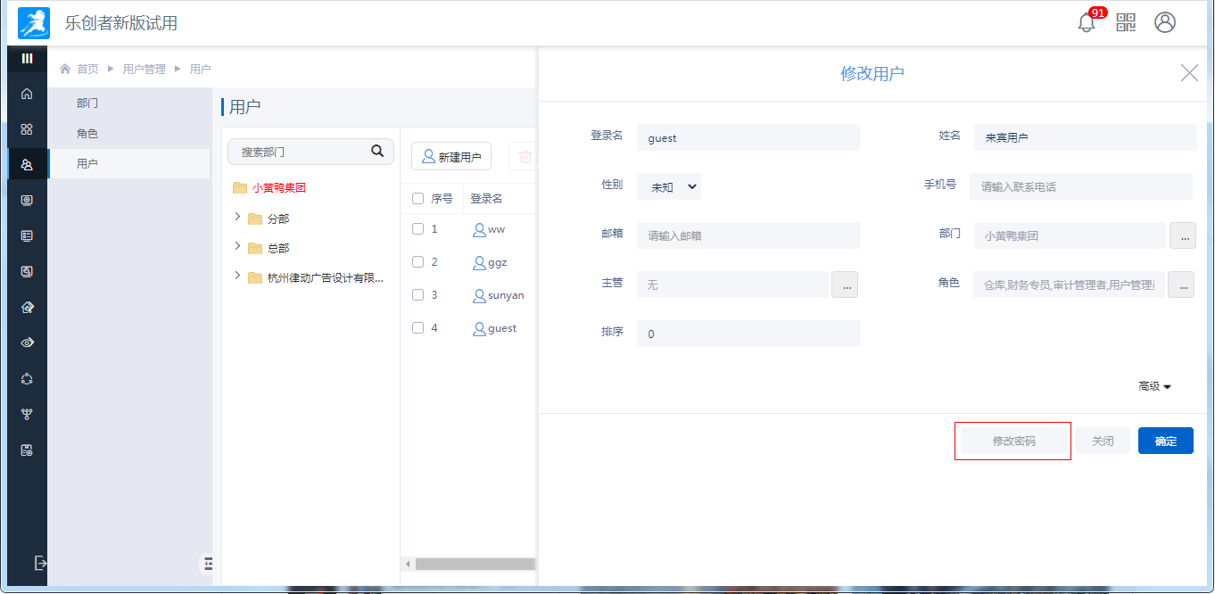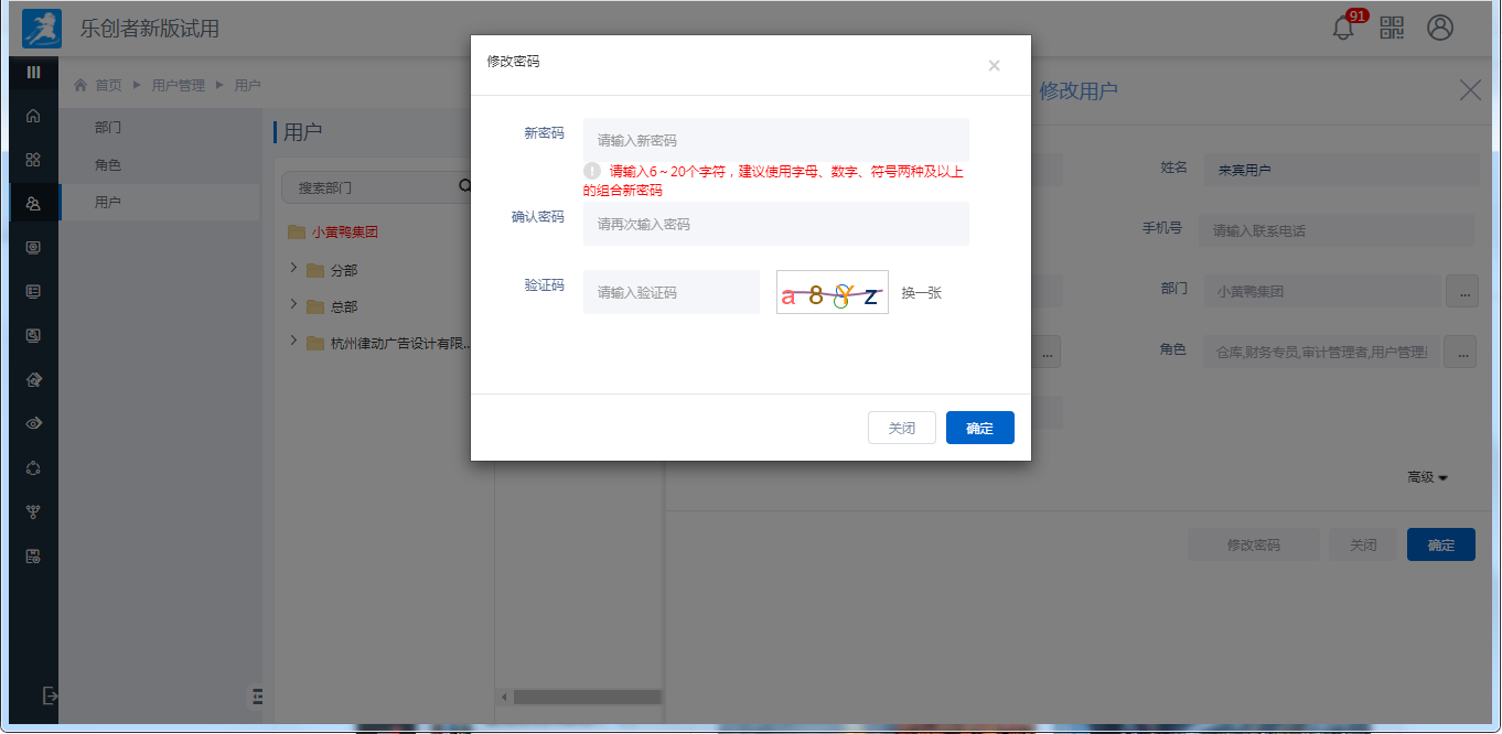 点击“修改密码”输入新密码、确认密码和验证码,即可重置该用户密码。