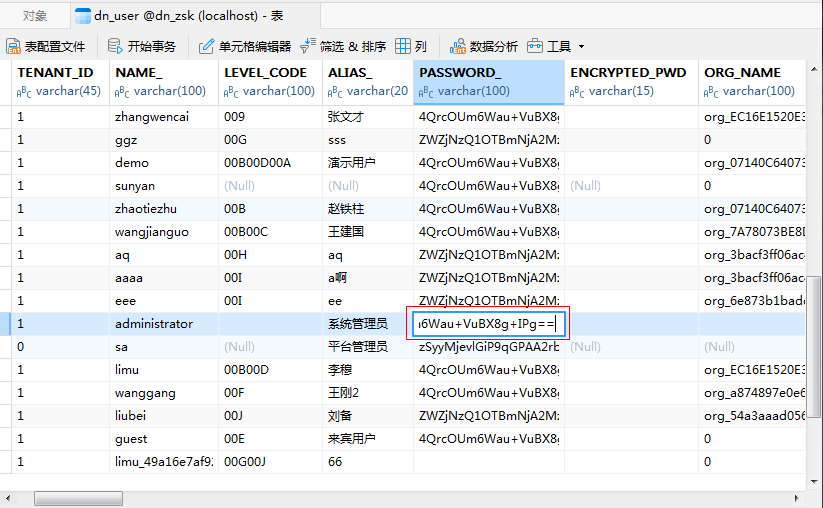 若系统管理员忘记密码无法进入系统,则需要通过更改数据库表“dn_user”中的“PASSWORD_”内容,填写的密码为掩码数据,如下图:
