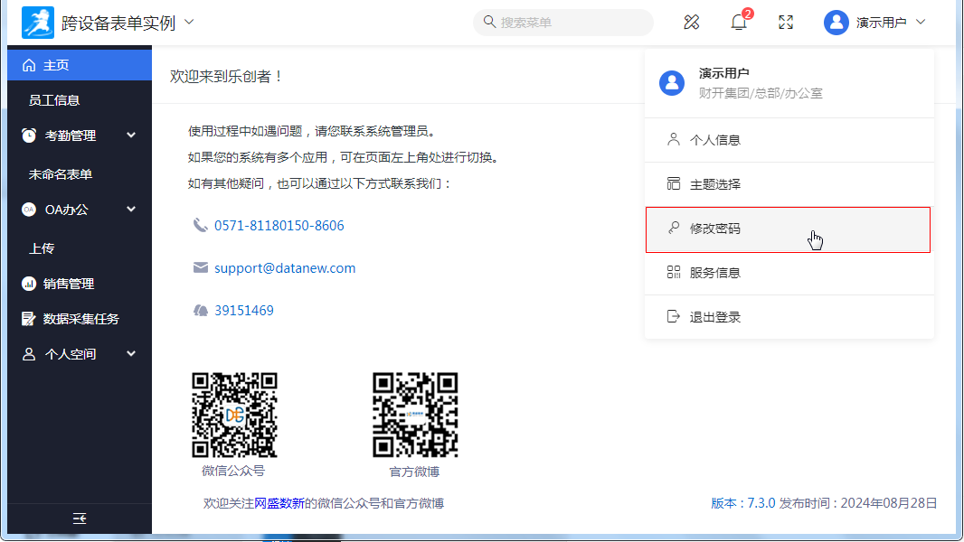 普通用户或系统管理员登录系统后,选择右上角的头像下拉功能“修改密码”,如下图: