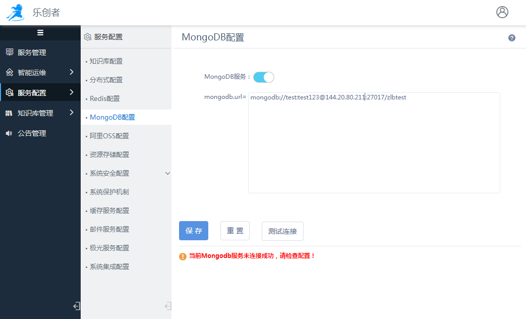 1 概述2 配置1 概述乐创者的系统监控日志和透视图表的功能都是基于MongoDB服务执行的。如果想要使用这些功能,平台管理员需要启用MongDB服务并配置连接。2 配置启用后,只需要输入正确的url串即可完成配置,点击“测试连接”可测试当前MongoDB服务是否能够正常连接,连接成功保存即可。作者:fancy 创建时间:2023-06-21 15:28最后编辑:fancy 更新时间:2025-09-15 16:13