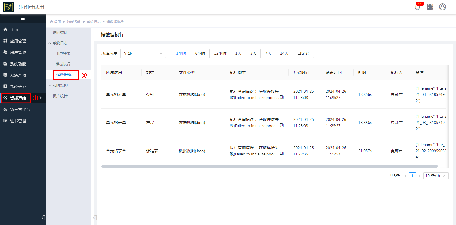 系统管理员登录系统后,执行[智能运维>系统日志>慢数据执行]菜单,此处显示的就是慢数据执行监控出来的慢数据。如下图:
