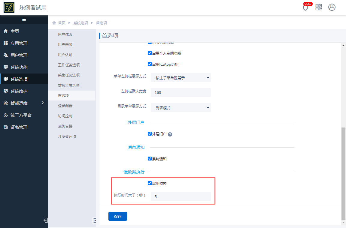 想要查看慢数据执行数据,需要先开启“慢数据执行”的监控,系统管理员登录系统后,进入[系统选项>首选项]菜单,开启慢数据执行的“启用监控”开关,并配置执行时间,如下图: