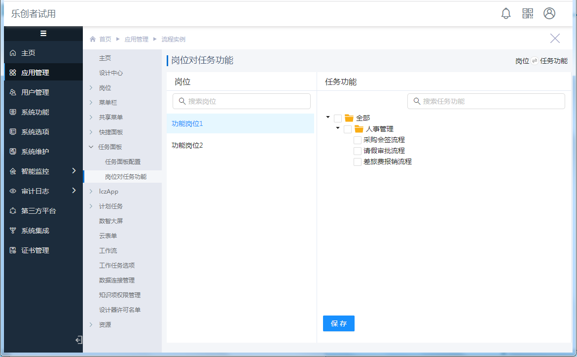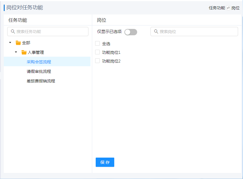 可选中某个岗位(此处只显示功能岗位,可通过“岗位管理”创建功能岗位,参考文档:岗位),勾选1个或多个分类或任务功能,最后点击“保存”按钮。