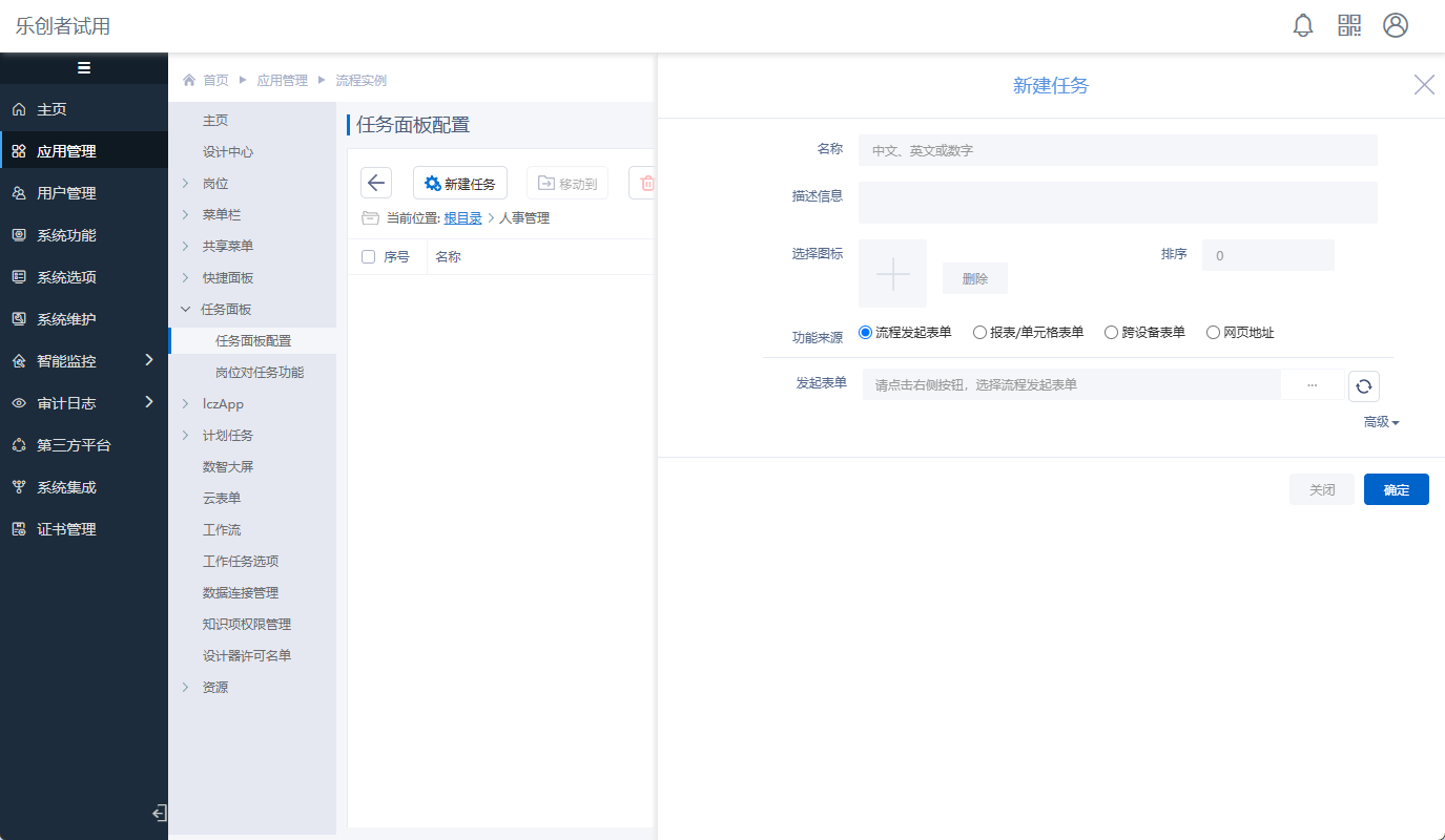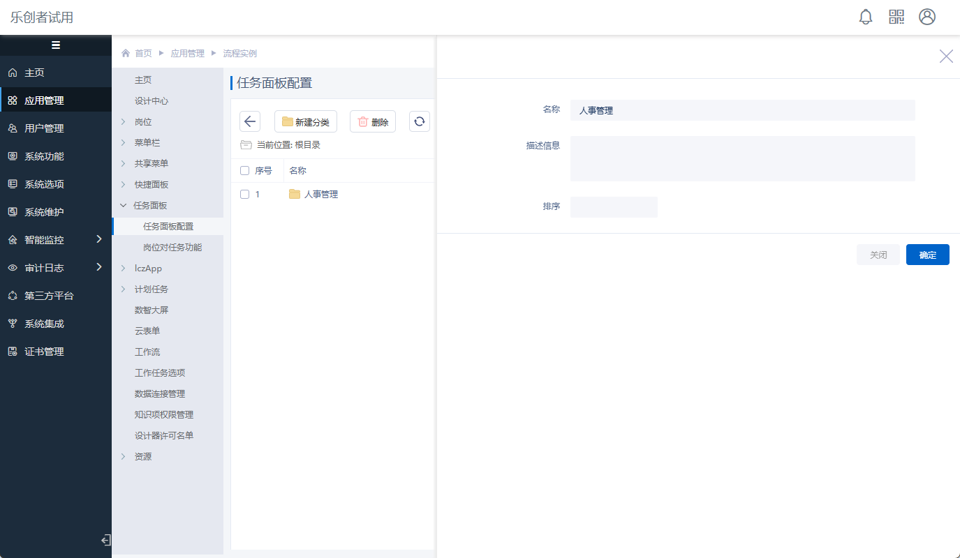 应用管理中的任务面板可用于配置系统用户可使用的工作任务面板菜单功能,主要是对流程发起表单菜单进行分类展示和“岗位对任务”权限管理。