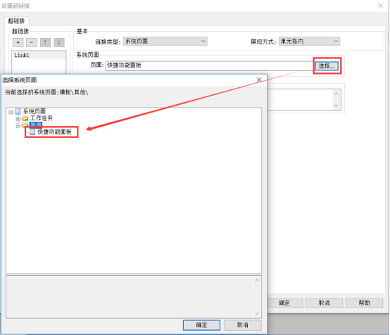 在场景报表豆腐块中鼠标右键选择“设置超链接”,进入超链接设置界面,选择链接类型“系统页面”、展现方式“单元格内”,页面选择“快捷功能面板”。