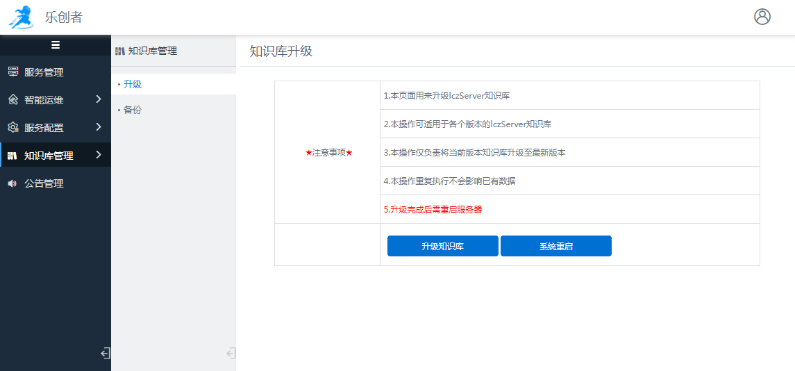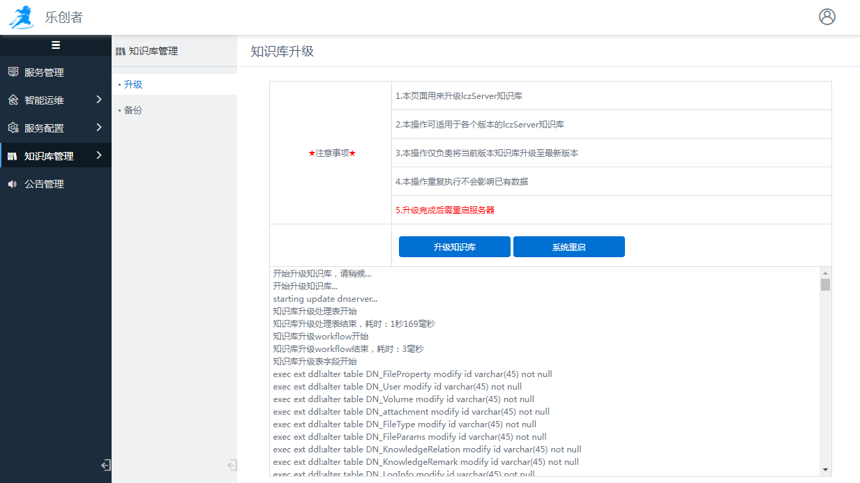 1 概述2 配置1 概述更新服务之后,若知识库存在增删表等变动,为了不影响相关功能的使用,则需要平台管理员在知识库管理中对知识库进行升级。2 配置服务端升级后往往需要对知识库进行升级。点击“升级”按钮,一键升级知识库,等待完成即可。升级完成之后需要重启服务,可以直接点击“系统重启”进行服务器的重启。作者:fancy 创建时间:2023-06-21 15:34最后编辑:fancy 更新时间:2025-09-15 16:13
