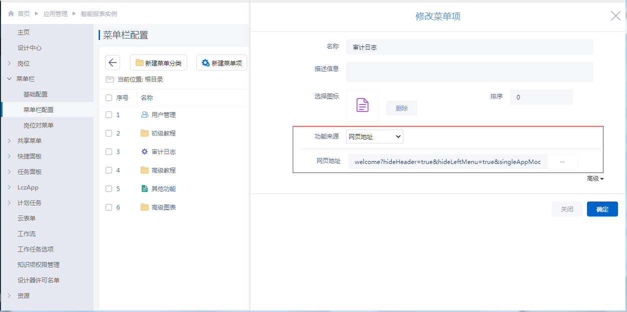 普通用户需要使用新版门户访问审计日志功能,除了为用户赋予“审计管理员”角色,还需要配置菜单并分配菜单权限,菜单配置如下: