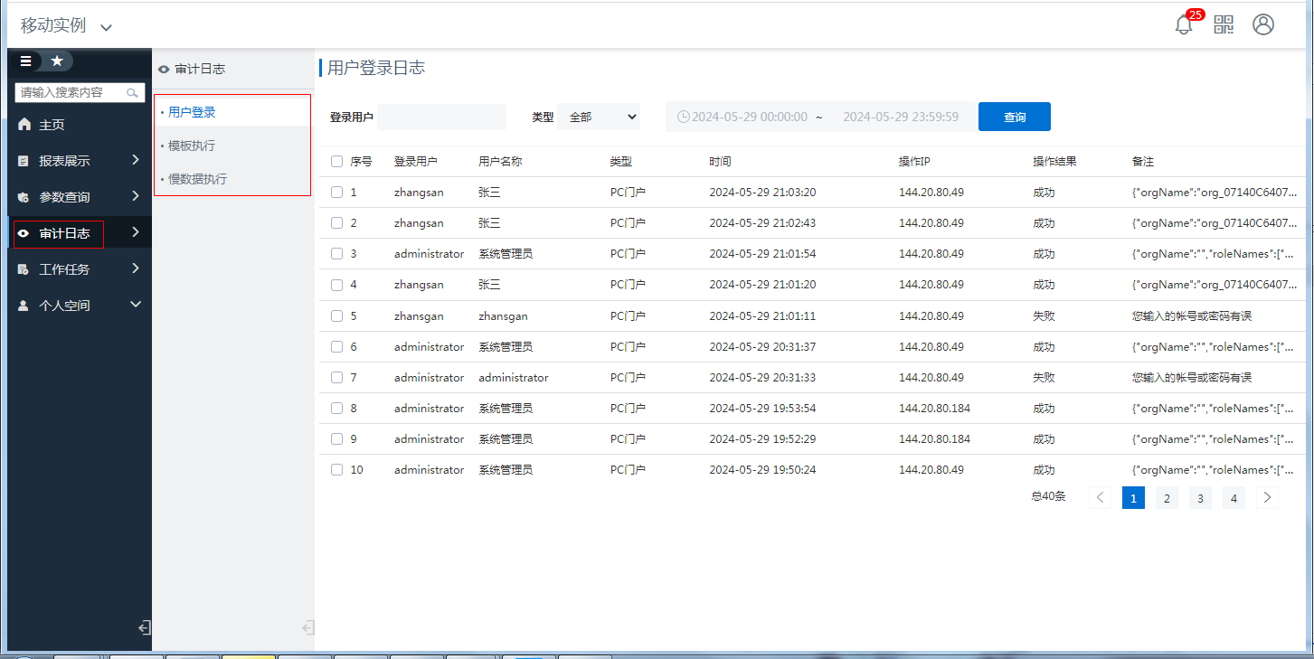 拥有的功能同系统管理员的“审计日志”功能,包括:用户登录、模板执行、慢数据执行、消息日志。
