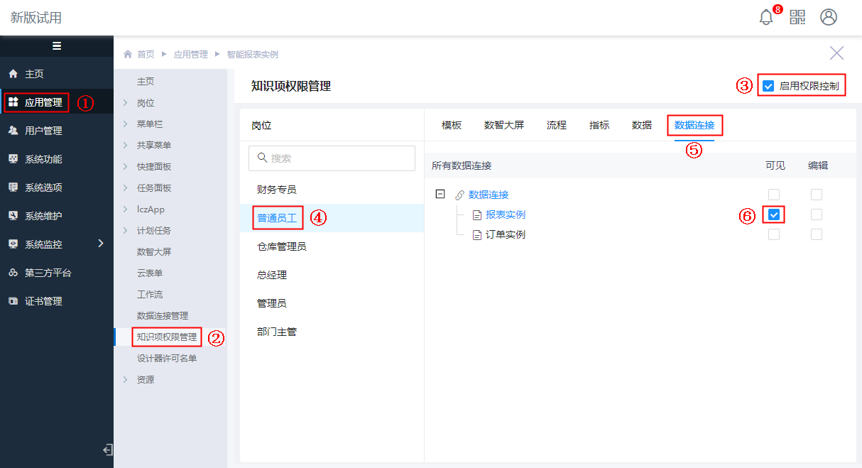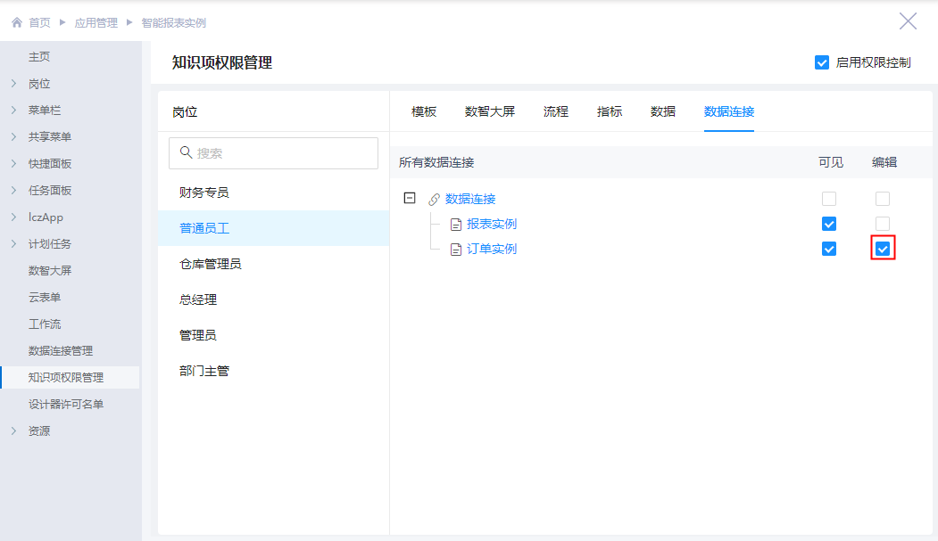 点击“知识项权限管理”菜单,勾选“启用权限控制”,选择“普通用户”岗位,为“数据连接”权限中的“报表实例”勾选[可见]权限,如下图: