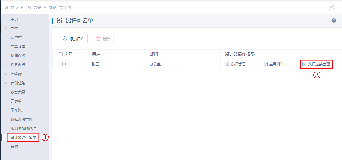 另外,还要进入“设计器许可名单”中将“张三”的[数据连接管理]权限勾选上,如下图: