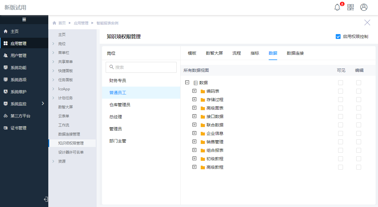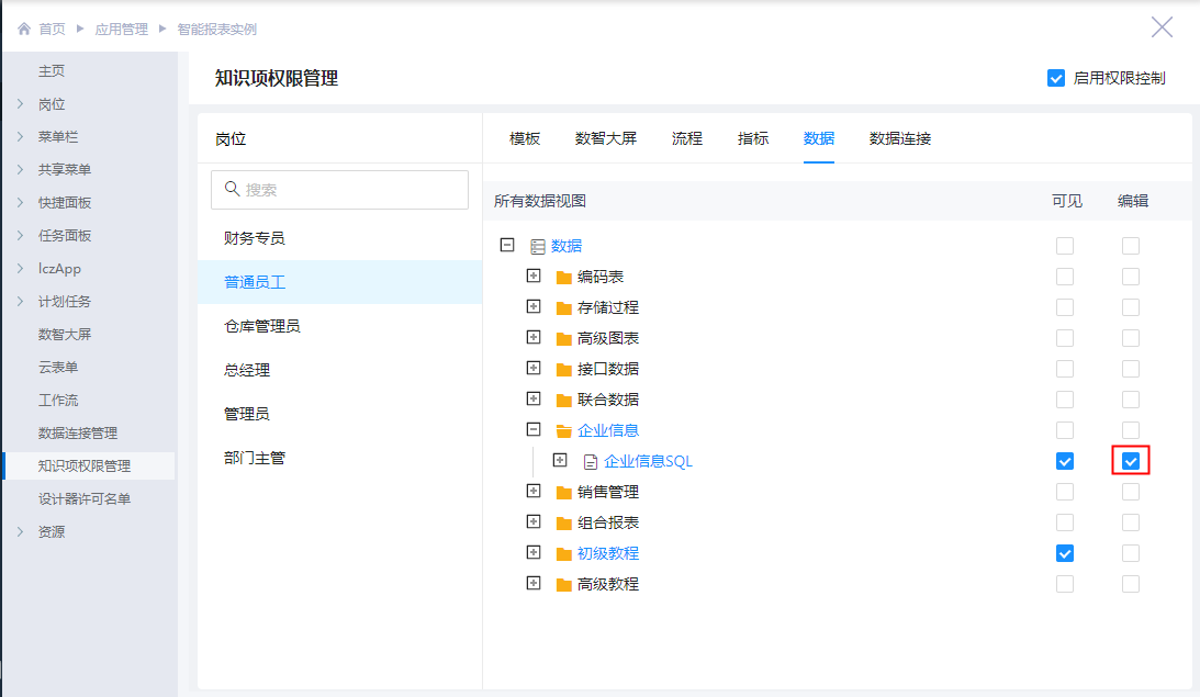 点击“知识项权限管理”菜单,勾选“启用权限控制”,选择“普通员工”岗位,为“数据”权限中的“初级教程”目录勾选[可见]权限,如下图: