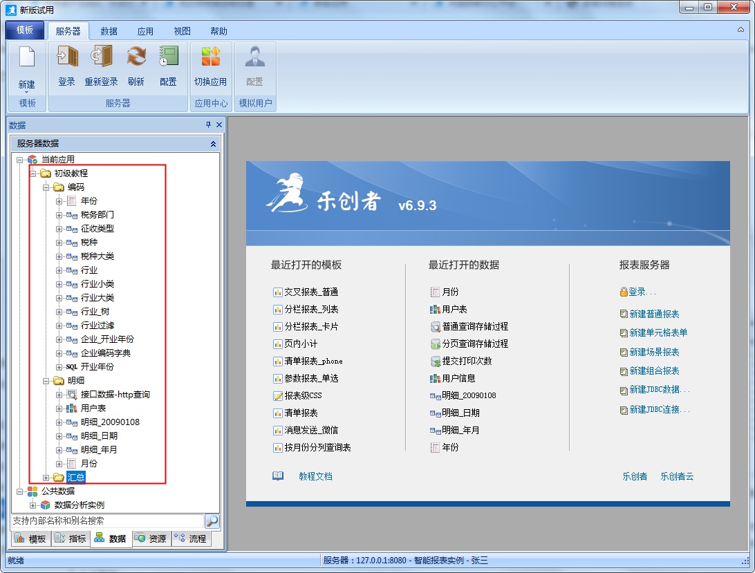 使用“张三”的账号和密码登录设计器,选择“智能报表实例”应用,进入“数据”tab,我们可以看到仅能看到有可见权限的数据,无可见权限的数据则不会显示,如下图: