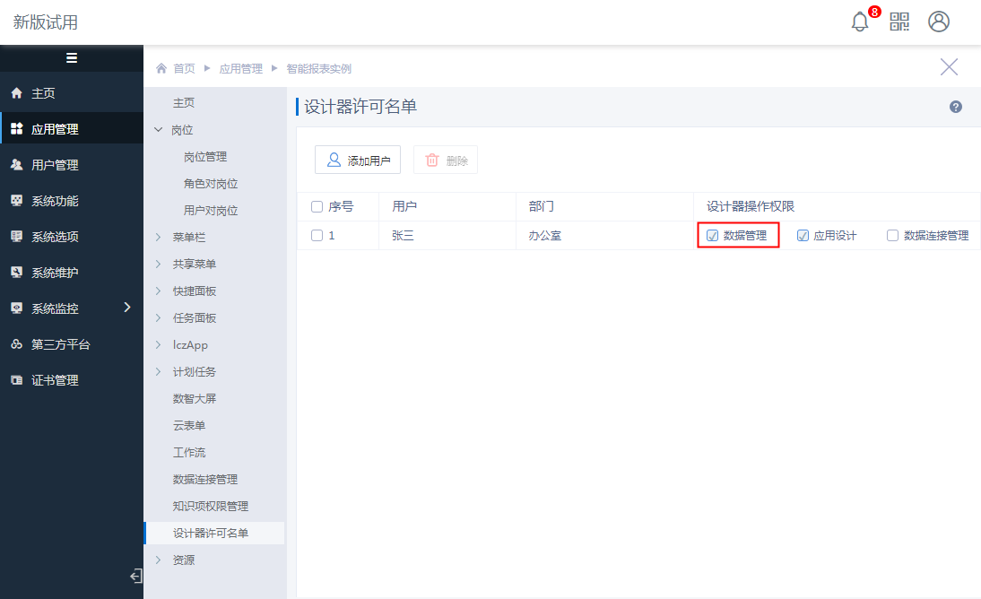 另外,还要进入“设计器许可名单”中将“张三”的[数据管理]权限勾选上,如下图: