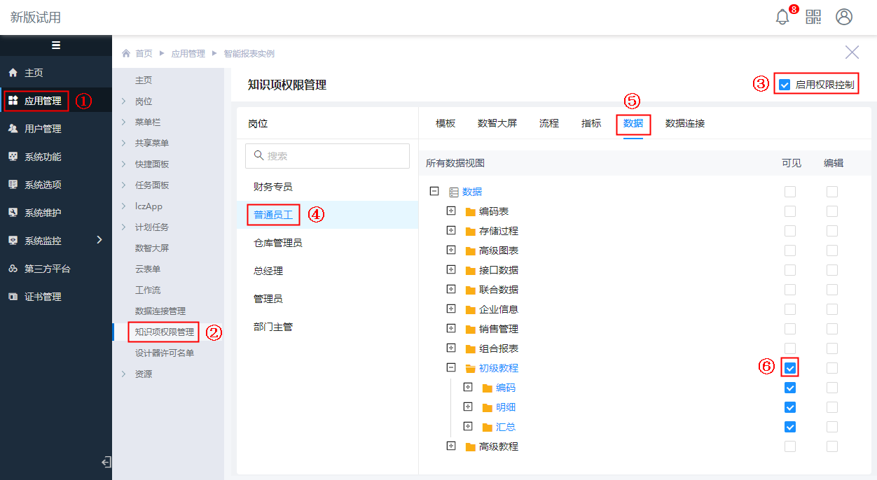示例:将智能报表实例应用中的数据”初级教程”以及子对象的[可见]权限,分配给拥有“普通员工”岗位的用户”张三”。
