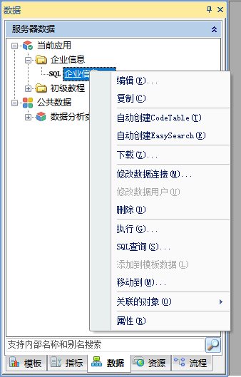 同样使用“张三”的身份登录设计器,此时“张三”则拥有了“企业信息SQL”的编辑权限,即可以对该数据视图进行修改、复制、下载、移动、删除等操作。如下图: