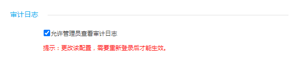 用于是否将“审计日志”菜单功能开放给系统管理员,关闭“允许管理员查看审计日志”时,系统管理员的菜单功能中将不再显示“审计日志”功能了。