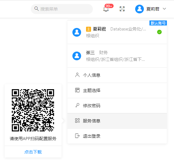 支持配置是否需要启用lczApp功能,若启用,则用户头像下拉菜单将显示“服务信息”功能,通过lczApp扫码可以快速配置服务。