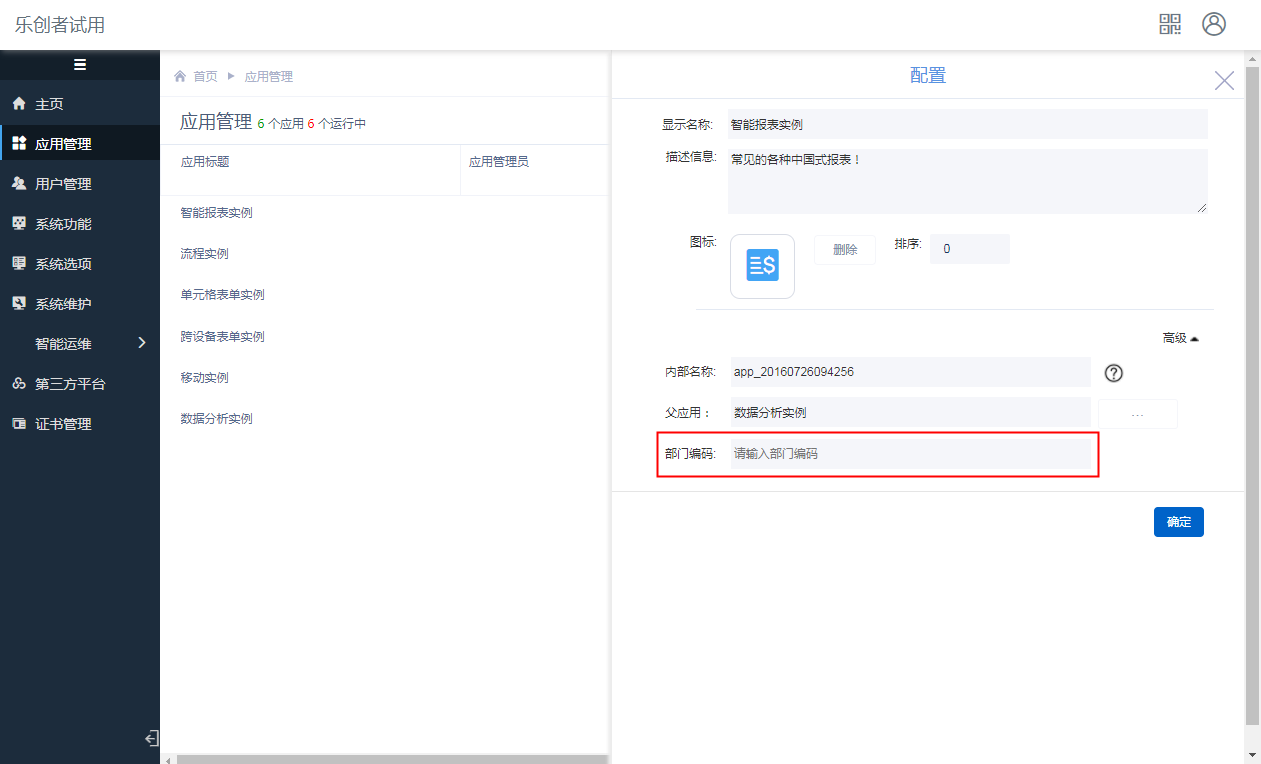 当应用以树型展示时,还支持“树型应用列表只显示本级及上级所有应用”配置,但该功能需要配合应用配置中的“部门编码”功能一起使用。