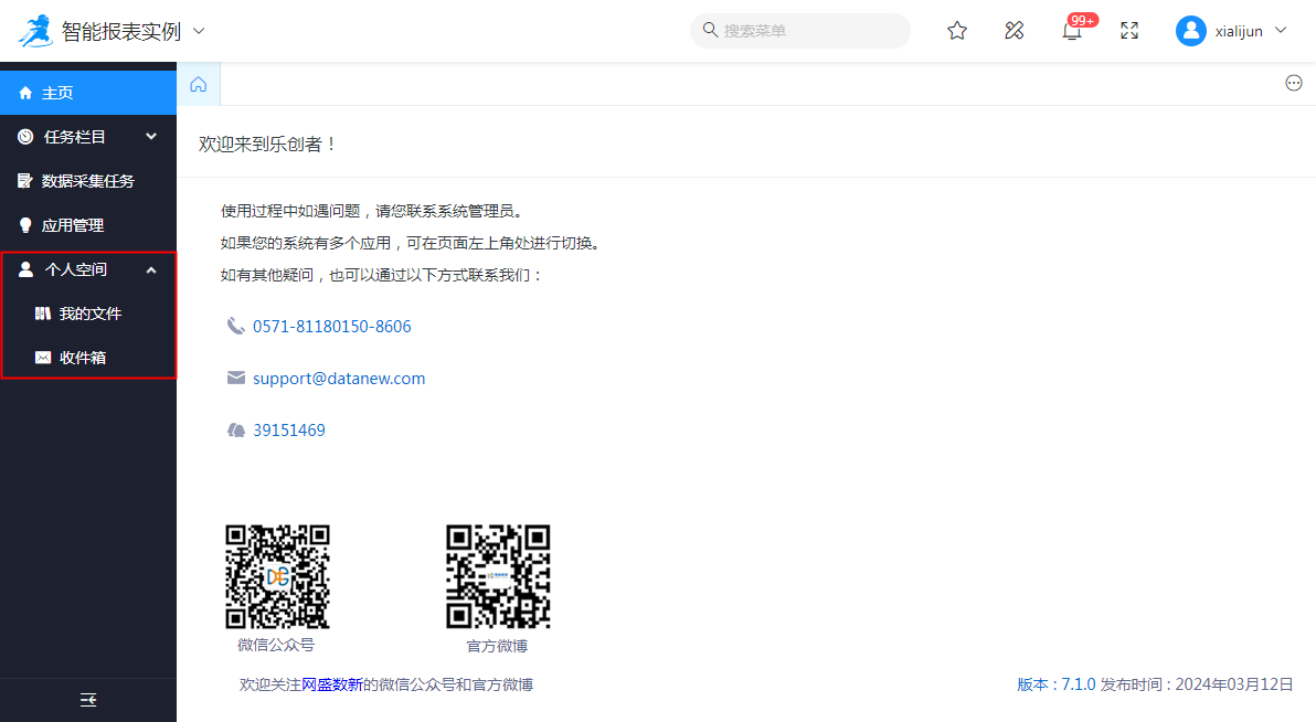 可选择是否使用“个人空间”系统功能,当不启用时,用户登录后将不显示“个人空间”菜单,并且其他引用个人空间系统功能的场景均不能正常访问该页面功能。