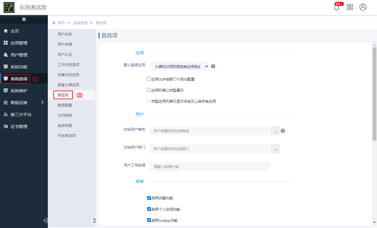 首选项主要是针对系统相关功能的全局配置,包括应用、角色、菜单等配置。