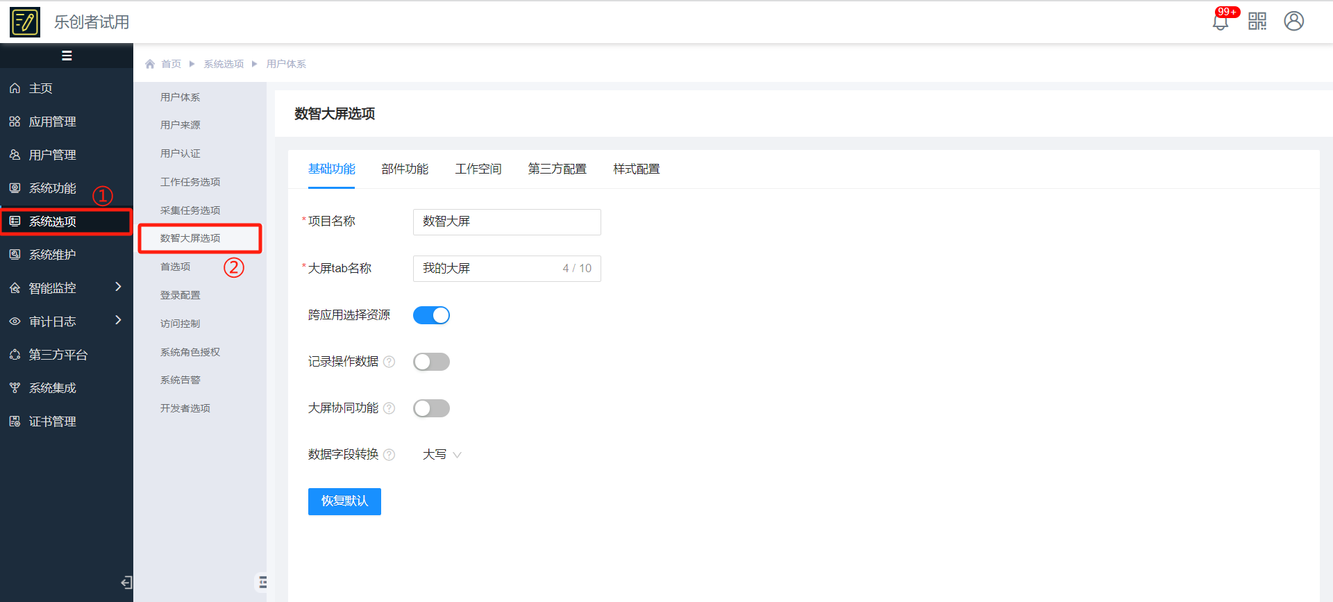 在数智大屏选项中可以配置与数智大屏相关的公共配置。