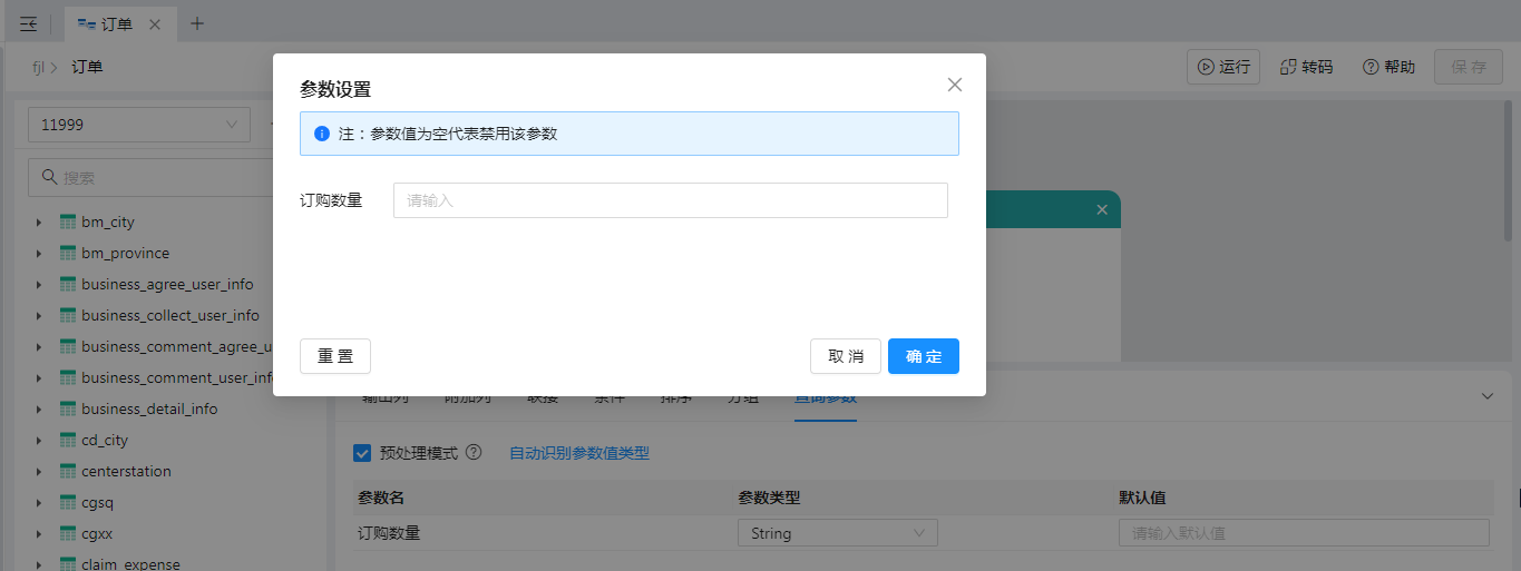 模型设计好之后,可点击“运行”进行调试,如果存在参数,可设置对应的参数值进行查询,为空表示禁用该参数,如下图: