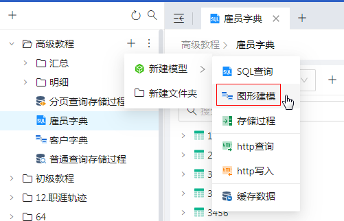 “图形建模”模型是对“SQL查询”的一个图形化方式的操作,本质仍旧是SQL,简单数据查询可以使用该模式。