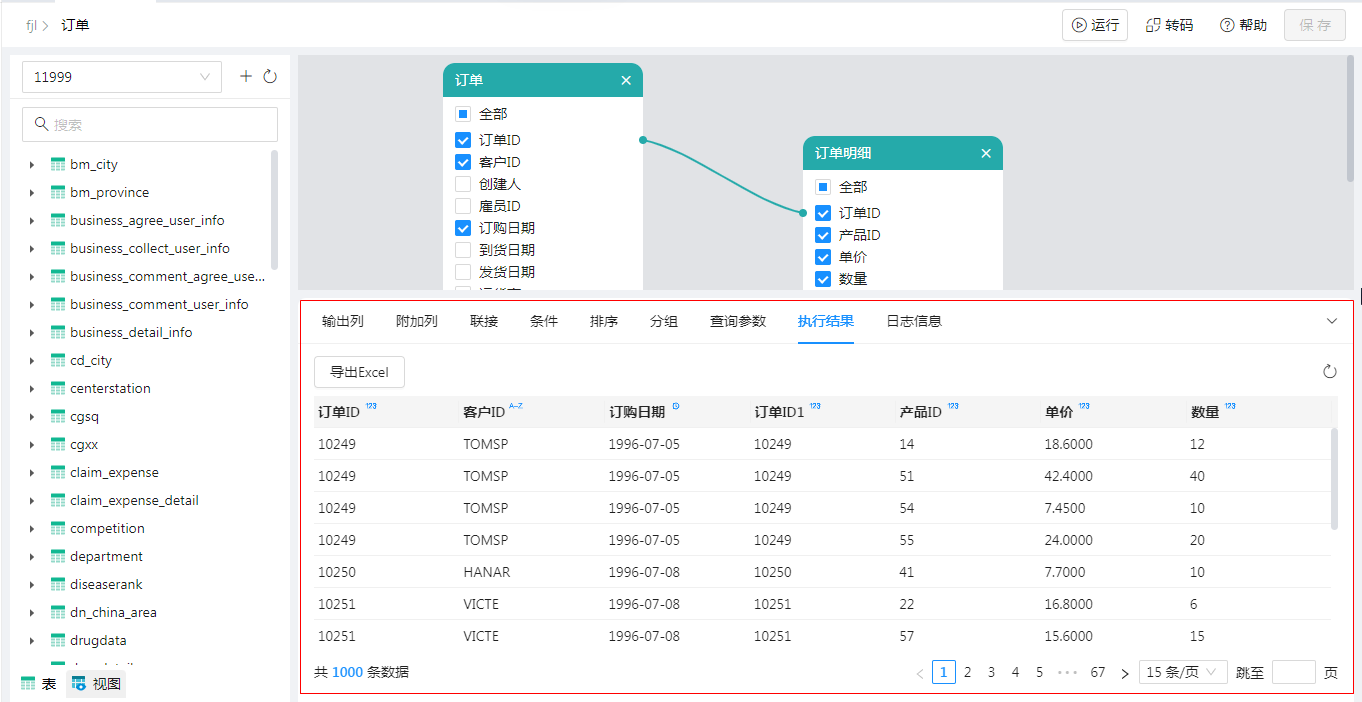 点击“确定”即可在下方“执行结果”Tab中查询到对应的数据,最多显示1000条数据,如下图: