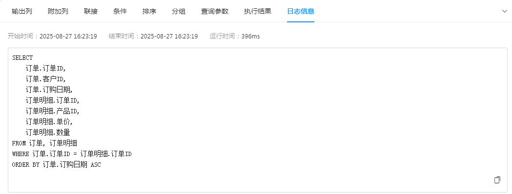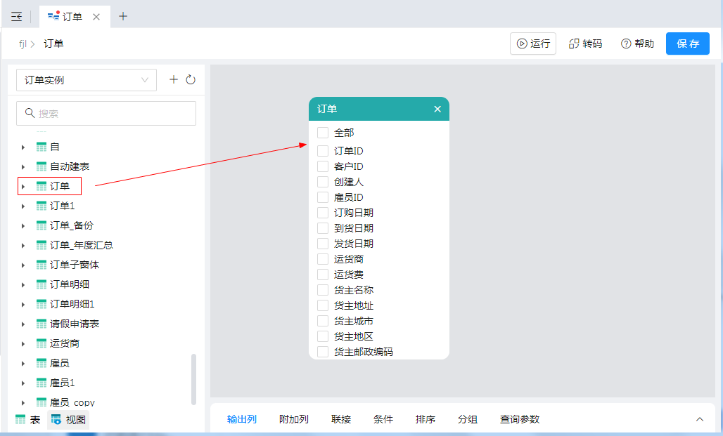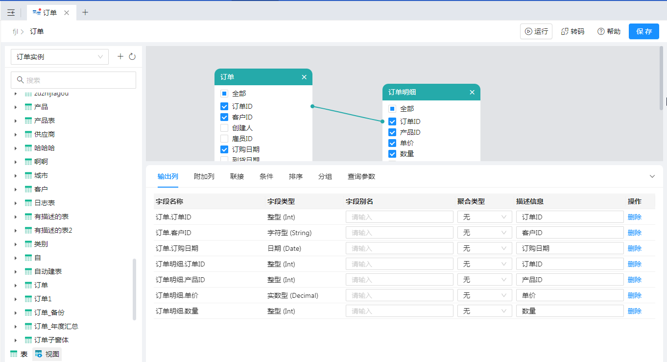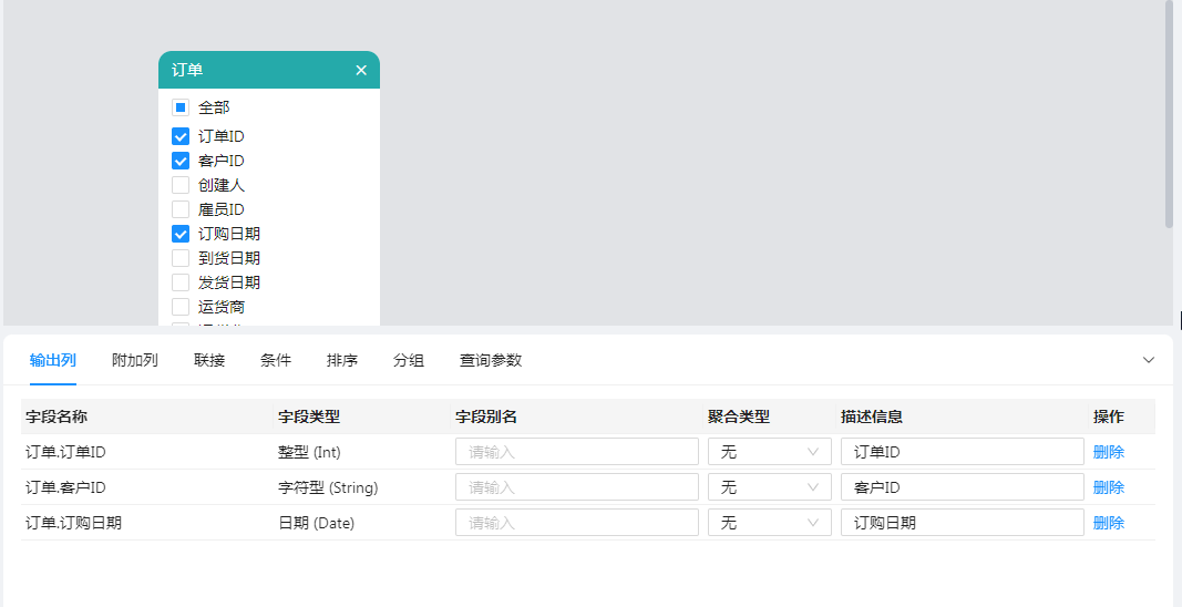 显示图形上勾选的输出字段,对应SQL语句的直接SELECT的字段名,支持进行字段别名、聚合类型、描述信息设置。