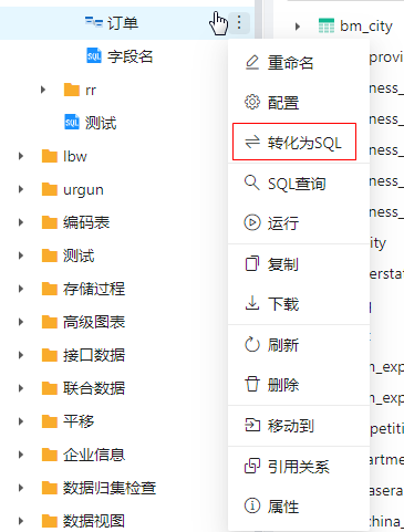 SQL查询(图形)模型通过菜单操作“转换为SQL”即可将其转换为SQL查询模型,如下图: