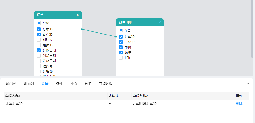 表之间的关联,目前只支持 INNER JOIN模式。添加多个表后,在上方的图形设计区域通过拖拽设置关联字段,即可查看表联接关系。