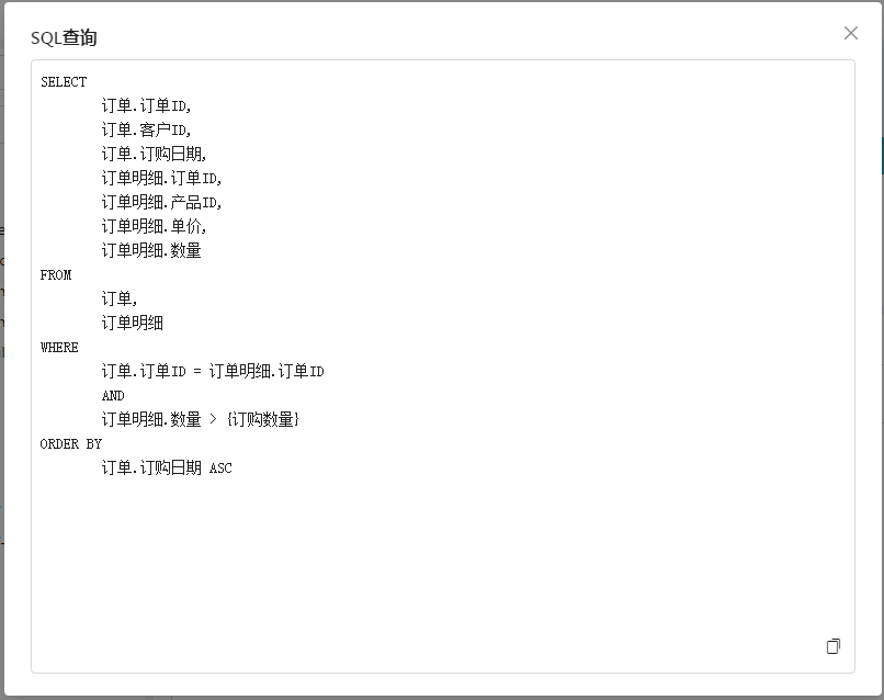 设置完成后,可以在左侧模型树的菜单上点击“SQL查询”查看对应的完整SQL语句,如下图: