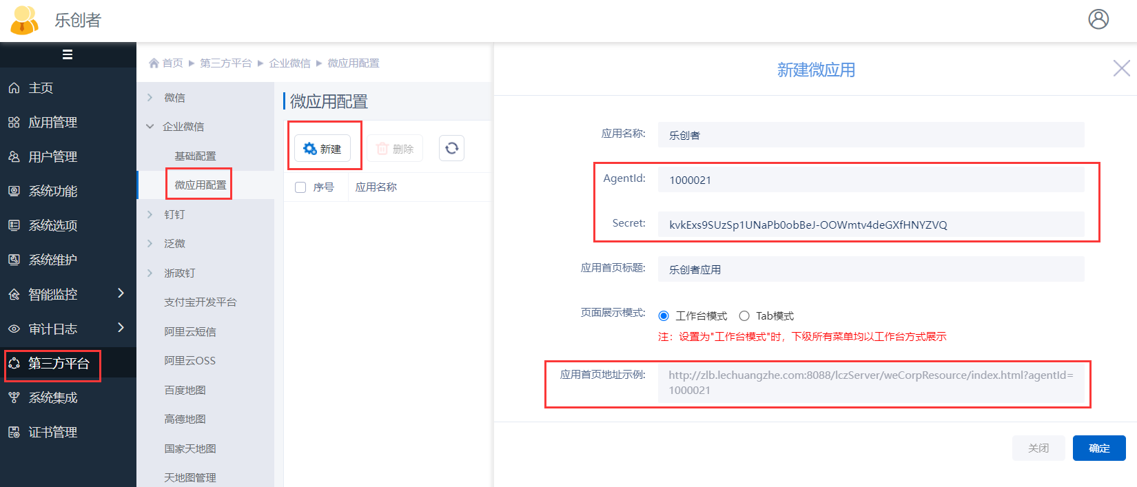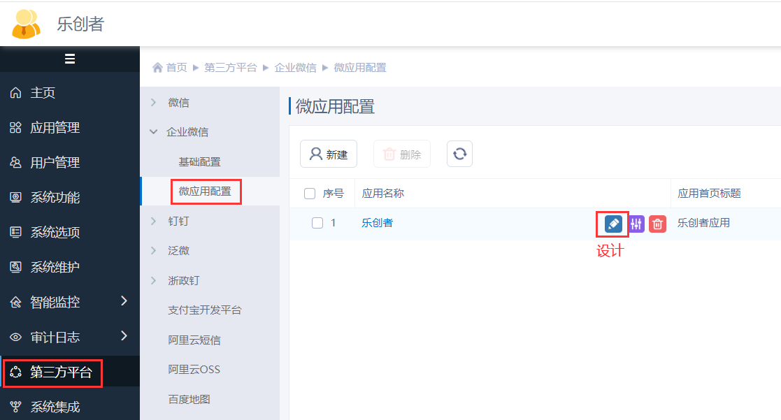 左侧菜单中选择 “第三方平台->企业微信-> 微应用配置”,点击“新建”按钮创建一个乐创者的企业微信微应用,如下图所示: