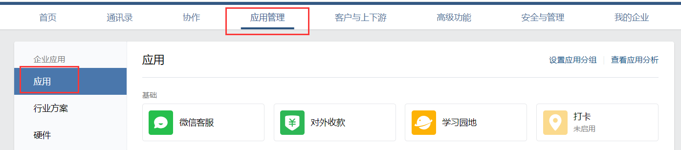 点击 “应用管理->企业应用->应用”,如下图所示: