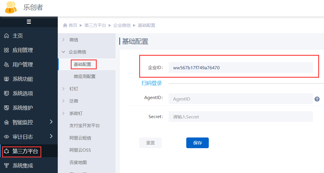 录入上述2.1.创建微应用章节介绍的在企业开发平台中创建的微应用的AgentId、Secret等信息,供乐创者系统与企业微信平台进行免登对接。