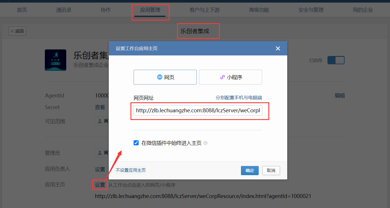 注意: 应用主页地址要确保可通过互联网进行访问,否则企业微信端访问不通。