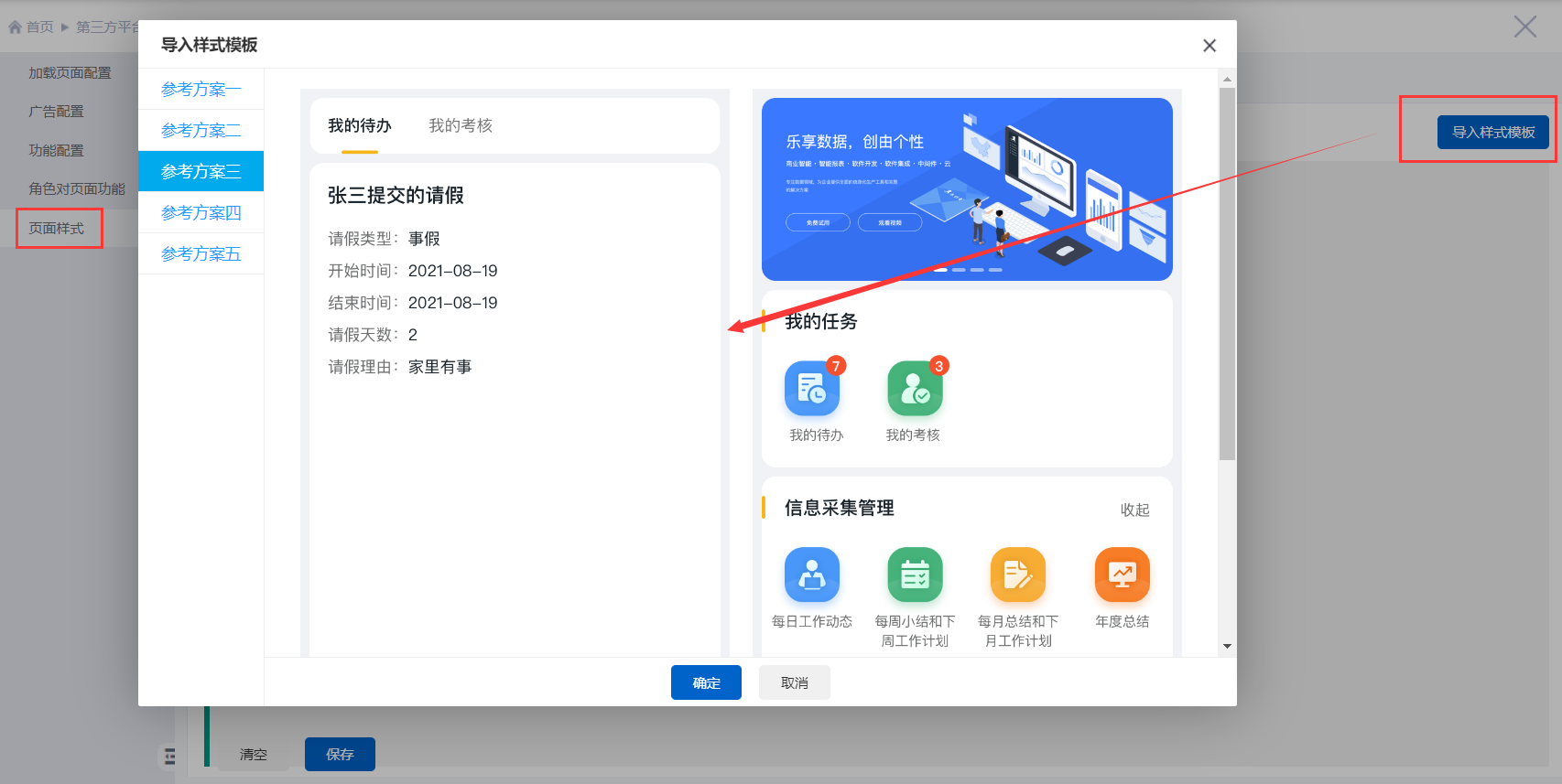 若对界面展示样式有个性化要求,乐创者提供了一些页面样式自定义功能,且提供了几套模板供选择,如下图: