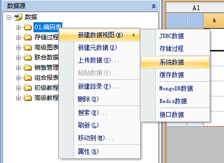 “数据”根目录或子目录右键执行“新建数据视图–》系统数据”菜单,创建一个系统数据。如下图: