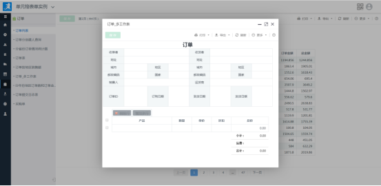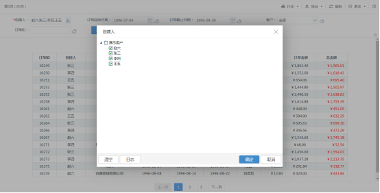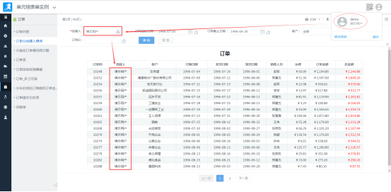 到此,实例就制作完成了,用户登录系统默认访问自己的订单数据,通过“创建人”选择即可查看对应下属用户的订单数据。