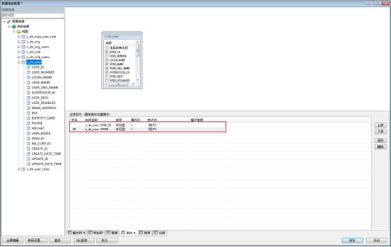使用“v_dn_user”视图,选择字段,添加过滤条件,过滤出用户和下属用户,如下图: