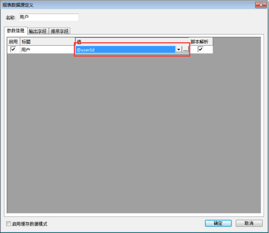 定义报表参数之前,需要准备对应的数据源:将准备好的系统数据拉入“订单分创建人查询”报表的数据源中,设置参数值,将当前登录用户ID传给参数“用户”。如下图: