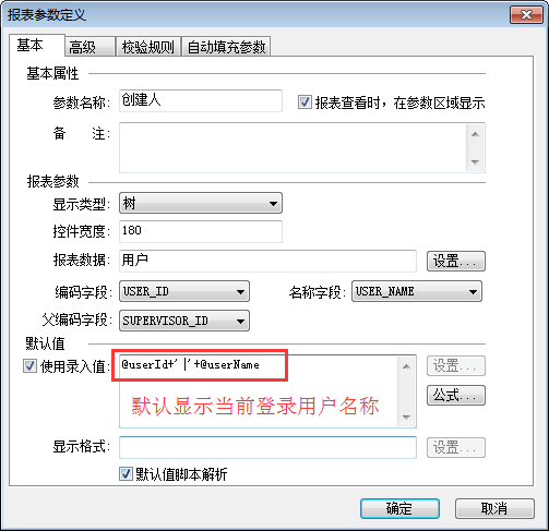 定义报表参数“创建人”,使用“树”控件,引用上一步骤中的数据源,进行相关的设置即可,如下图: