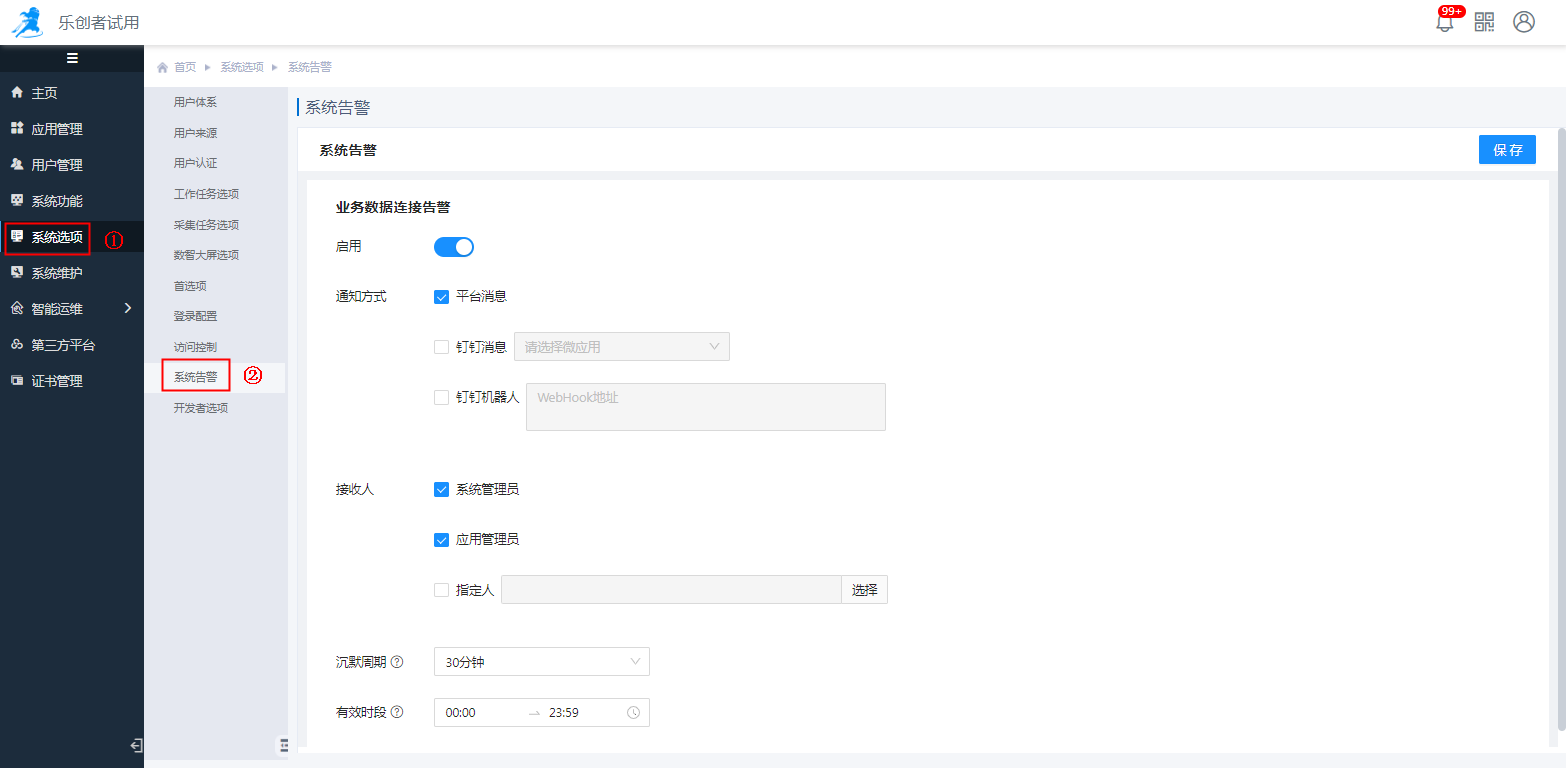 默认不启用,启用后需要设置通知方式、接收人、沉默周期和有效时段。