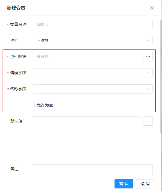 定义变量名称、控件、默认值等信息,其中“控件”目前支持:无和下拉框,选择下拉框时,需要选择控件数据并配置编码字段、名称字段、是否允许为空以及默认值,如下图: