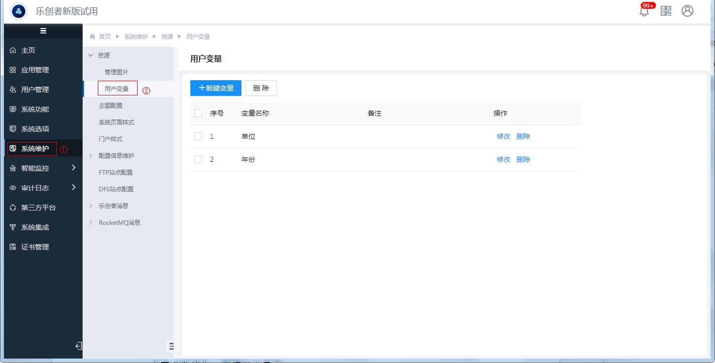 以“系统管理员”身份登录系统,进入“系统维护–》资源–》用户变量”界面,如下图: