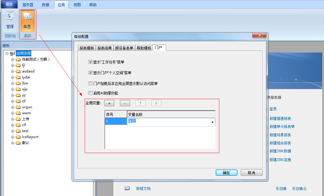 登录设计器,切换到需要显示变量的应用,进入工具栏“应用》高级配置”配置界面,切换到“门户”Tab,选择需要显示的变量即可,如下图: