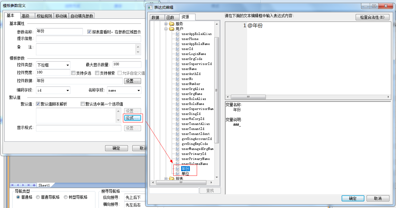 下面以报表为例,报表中需要存在用来接收全局变量值的参数,默认值勾选“默认值脚本解析”,通过表达式引用系统用户变量中系统管理员定义的全局变量即可。如下图:
