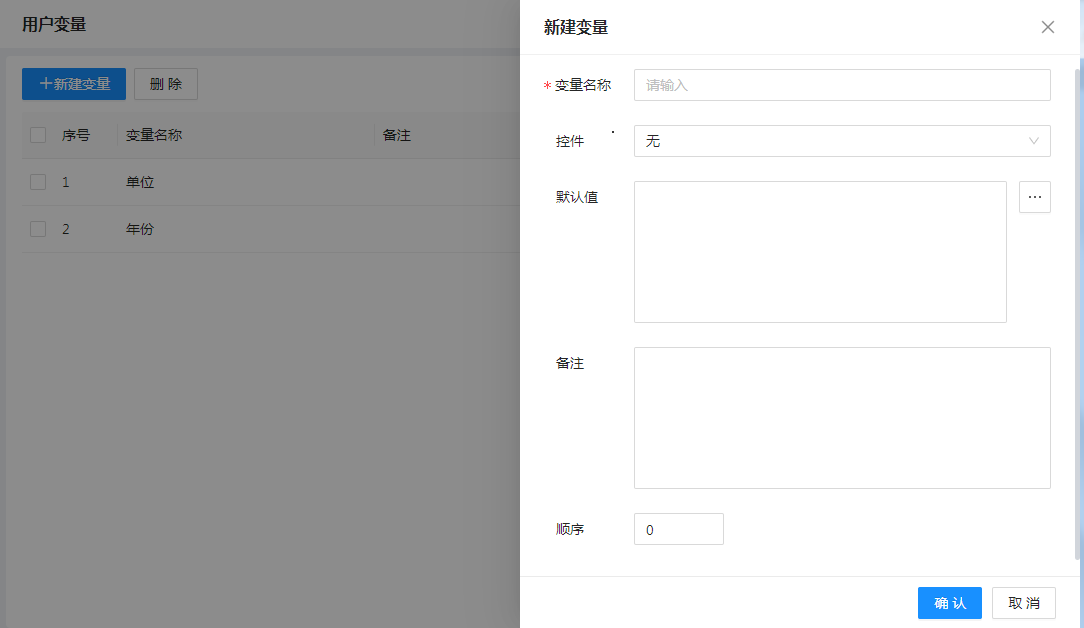 注:若变量值需要用户在门户端进行修改,需要选择有控件的控件类型,不能选择无控件。