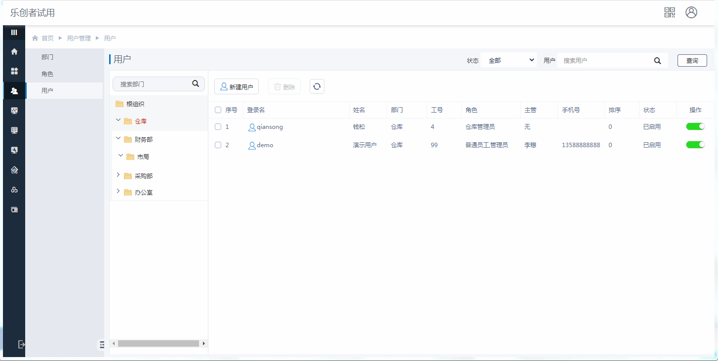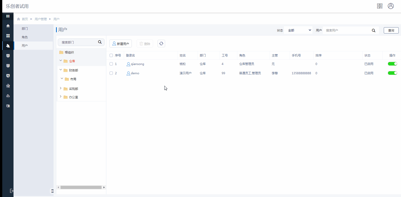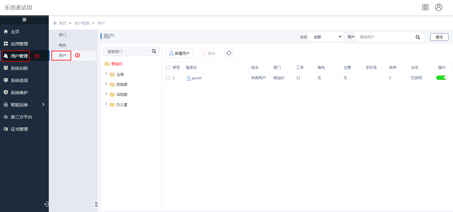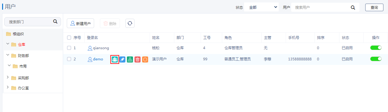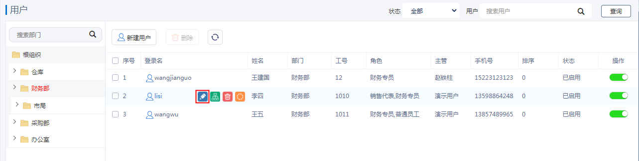 若某用户不允许使用,则将该用户操作列的开关关闭即可,如下图:注:禁用的用户将无法再登录系统。
